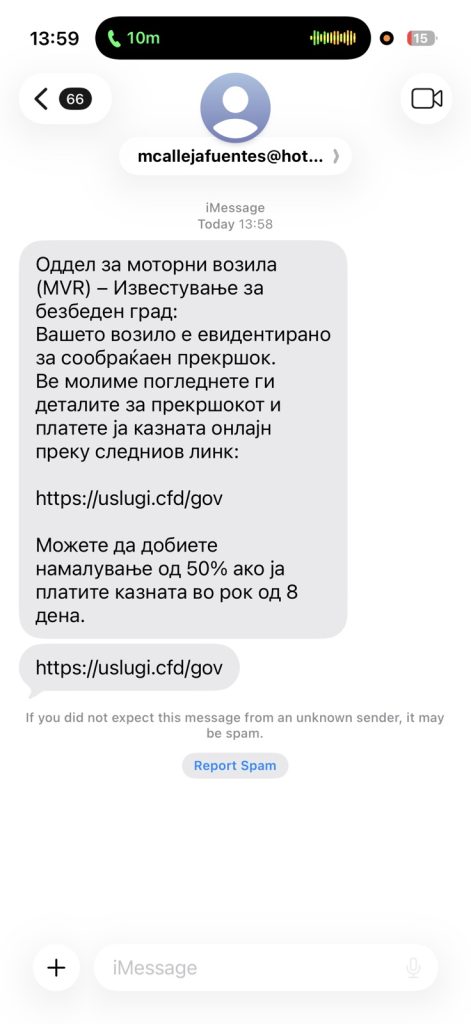 MKD-CIRT информира дека е детектирана активна фишинг (smishing) кампања во која граѓаните добиваат лажни SMS или iMessage пораки со наводно известување за сообраќаен прекршок и барање за итно плаќање казна преку линк.
