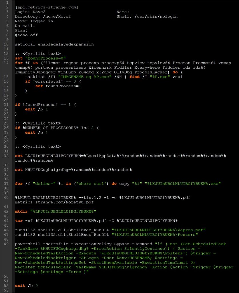 BleepingComputer откри дека ова е поразвиен напад, при што командите бараат алатки што вообичаено се користат во истражување на малвер и прекинуваат доколку ги пронајдат. Овие алатки ги вклучуваат filemon, regmon, procexp, procexp64, tcpview, tcpview64, Procmon, Procmon64, vmmap, vmmap64, portmon, processlasso, Wireshark, Fiddler, Everywhere, Fiddler, ida, ida64, ImmunityDebugger, WinDump, x64dbg, x32dbg, OllyDbg и ProcessHacker.