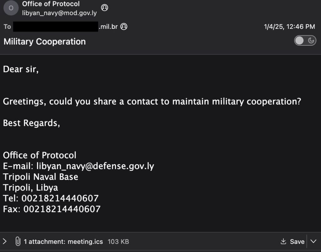 Напаѓачот го лажирал (spoofed) Канцеларијата за протокол на Либиската морнарица во е-пошта која испорачала zero-day експлоатација насочена кон бразилска воена организација.