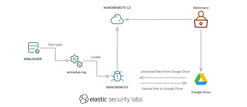 „Овие барања се извршуваат преку HTTP, при што JSON податоците се поднесуваат преку POST барања кои се компресирани со Zlib и енкриптирани со AES-CBC користејќи 16-бајтен клуч (558bec83ec40535657833d7440001c00),“ велат од Elastic. „URI-то за сите барања го користи /api/client со User-Agent (NanoRemote/1.0).“ Неговата примарна функционалност се реализира преку сет од 22 командни хендлери кои му овозможуваат да собира информации за хостот, да извршува операции со датотеки и директориуми, да стартува portable executable (PE) датотеки веќе присутни на дискот, да го чисти кешот, да симнува/качува датотеки на Google Drive, да паузира/продолжува/откажува пренос на податоци и да се исклучи сам.