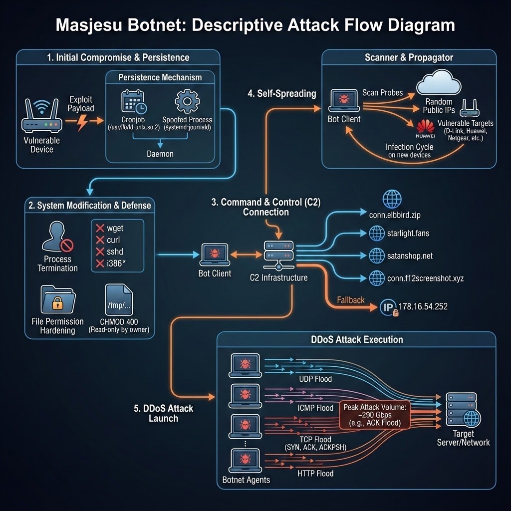 Наречен Masjesu, ботнетот се рекламира преку Telegram како услуга „DDoS-for-hire“ уште од неговото појавување во 2023 година. Тој е способен да таргетира широк спектар на IoT уреди, како што се рутери и gateway уреди, поддржувајќи повеќе архитектури.