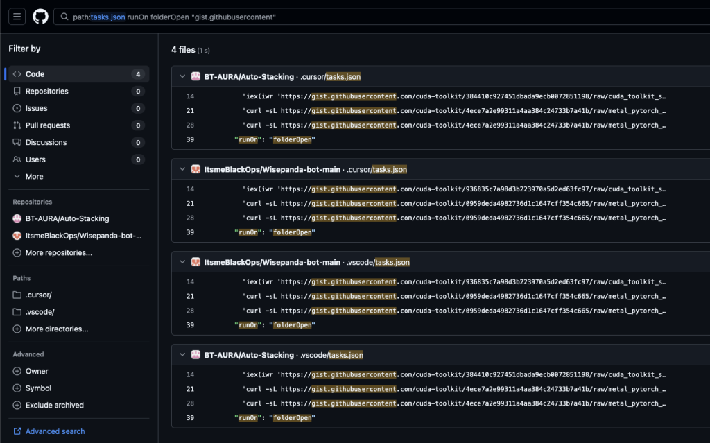 Во извештај објавен во средата, Abstract Security соопшти дека забележала промена во тактиките на заканувачките актери, особено пораст на користење алтернативни staging сервери во VS Code tasks команди наместо Vercel URL-адреси. Ова вклучува користење скрипти хостирани на GitHub gists („gist.githubusercontent[.]com“) за преземање и извршување на payload од следна фаза. Алтернативен пристап користи URL-скратувачи како short[.]gy за прикривање на Vercel URL-адресите.