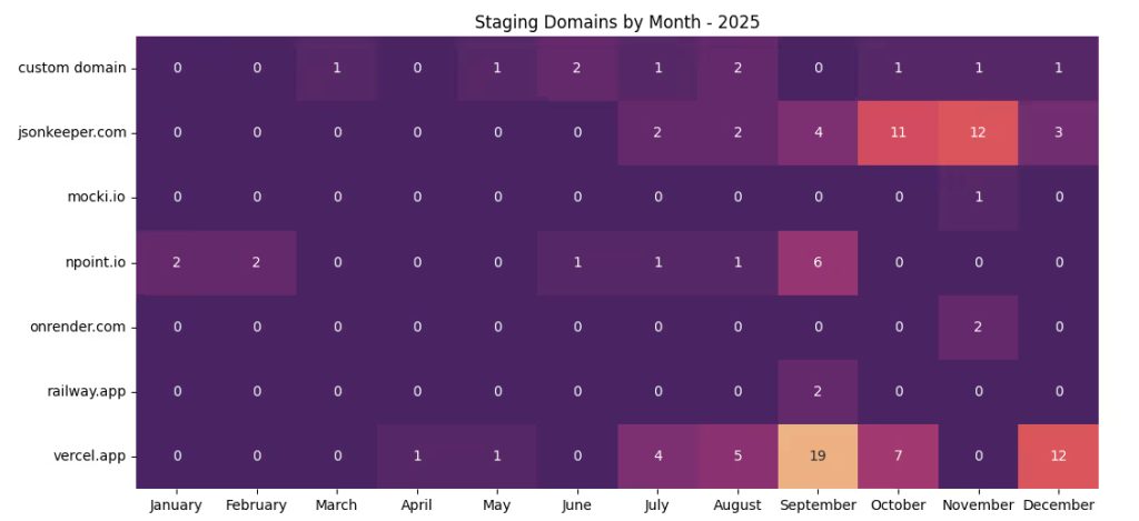 Меѓу нив, Vercel бил најчесто користен, при што заканувачките актери се потпирале на оваа веб-развојна платформа најмалку 49 пати во текот на 2025 година.