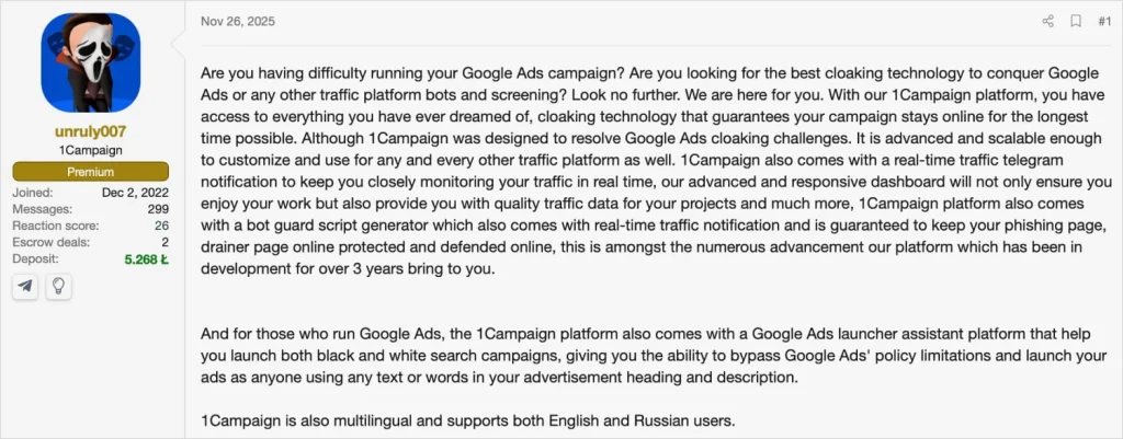 И покрај тоа што Google воведе повеќе заштитни механизми, неговата рекламна платформа сè уште се користи за промовирање измами, малициозен софтвер и crypto-drainer страници. Сепак, 1Campaign се издвојува бидејќи е специјално дизајнирана за лансирање малициозни реклами што ја поминуваат автоматската проверка на Google и најверојатно остануваат активни сè додека жртвите не ги пријават или кампањата не биде рачно пријавена.