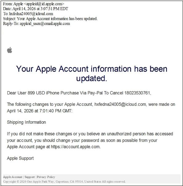 Предупредувањата за промени на Apple сметки се злоупотребуваат за испраќање лажни фишинг измами за купување iPhone, вметнати во легитимни е-пораки испратени од серверите на Apple, со што се зголемува нивната веродостојност и потенцијално им се овозможува да ги заобиколат филтрите за спам.