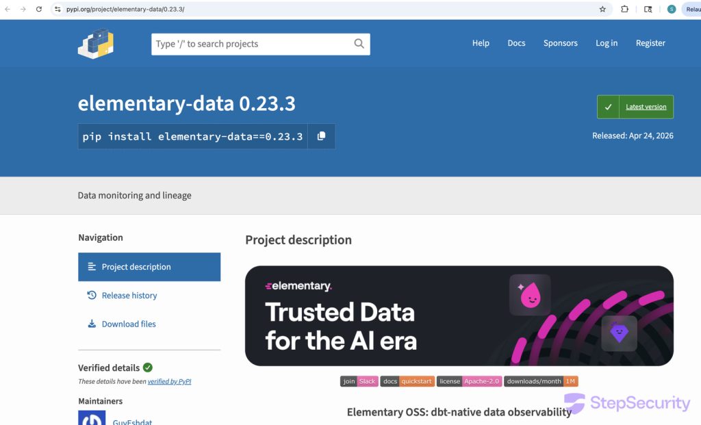 Пакетот elementary-data е open-source алатка за data observability за dbt (Data Build Tool), главно користена од инженери за податоци и аналитика за работа со data pipelines. Тој е широко користен во dbt екосистемот со над 1.1 милион месечни преземања на PyPI.