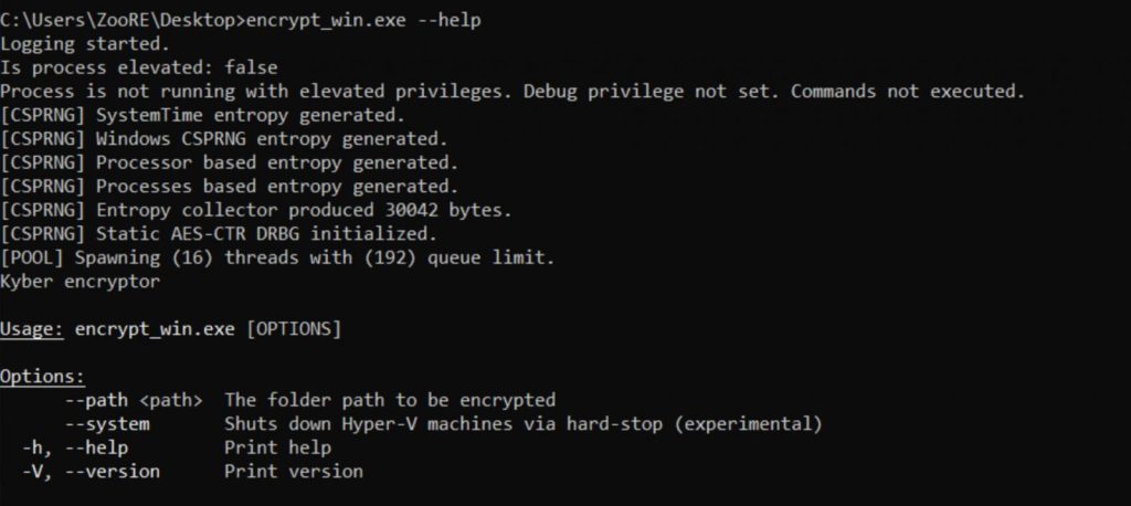 Windows варијантата, напишана во Rust, користи Kyber1024 и X25519 за заштита на клучевите, што се совпаѓа со тврдењата во пораката за откуп.