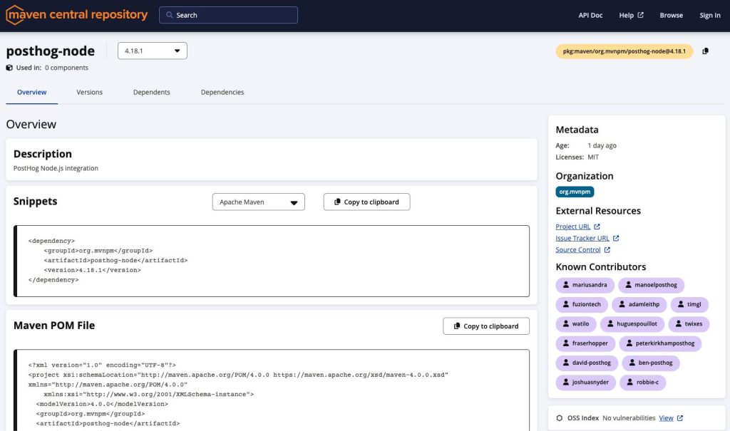 Важно е да се напомене дека пакетот од Maven Central не е објавен директно од PostHog. Наместо тоа, координатите „org.mvnpm“ се генерирани преку автоматизиран mvnpm процес што ги преработува npm пакетите во Maven артефакти. Од Maven Central соопштија дека работат на воведување дополнителни заштити за да спречат веќе познати компромитирани npm компоненти повторно да се пакуваат. Заклучно со 25 ноември 2025 година во 22:44 UTC, сите огледални копии биле отстранети.