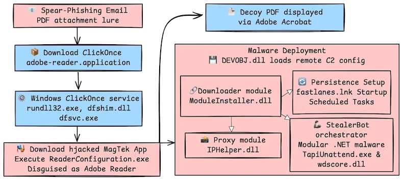 ClickOnce апликацијата е легитимен извршен фајл од MagTek Inc. („ReaderConfiguration.exe“) кој се претставува како Adobe Reader и е потпишан со валиден дигитален потпис за да не предизвика сомнежи. Дополнително, барањата кон командно‑контролниот (C2) сервер се регионално ограничени на Јужна Азија, а патеката за преземање на payload‑от се генерира динамички, што го отежнува анализирањето.