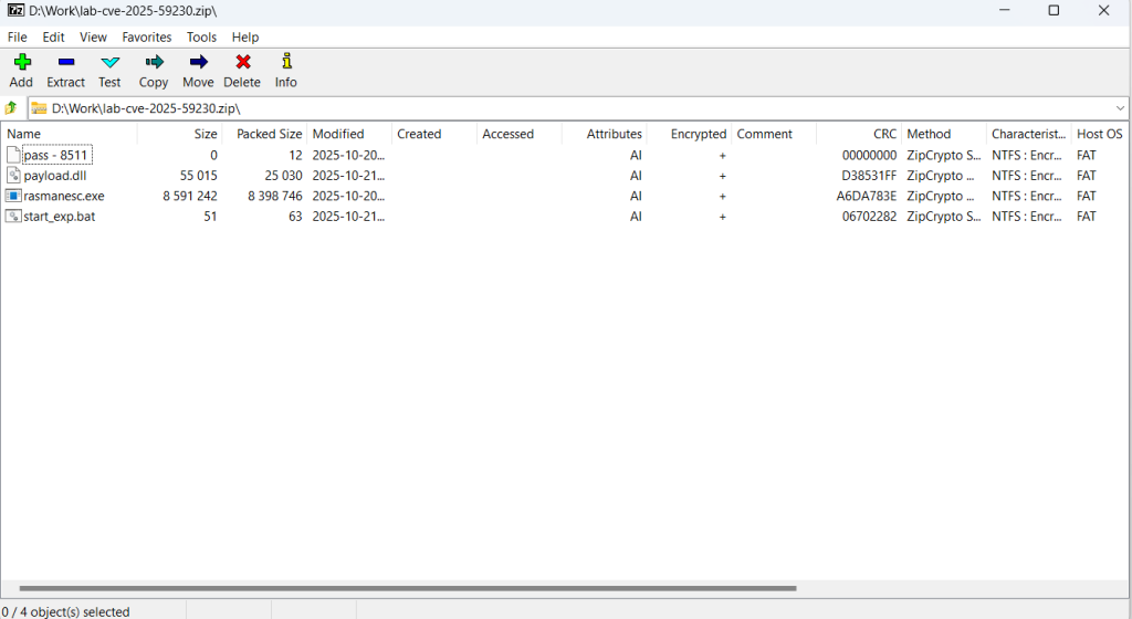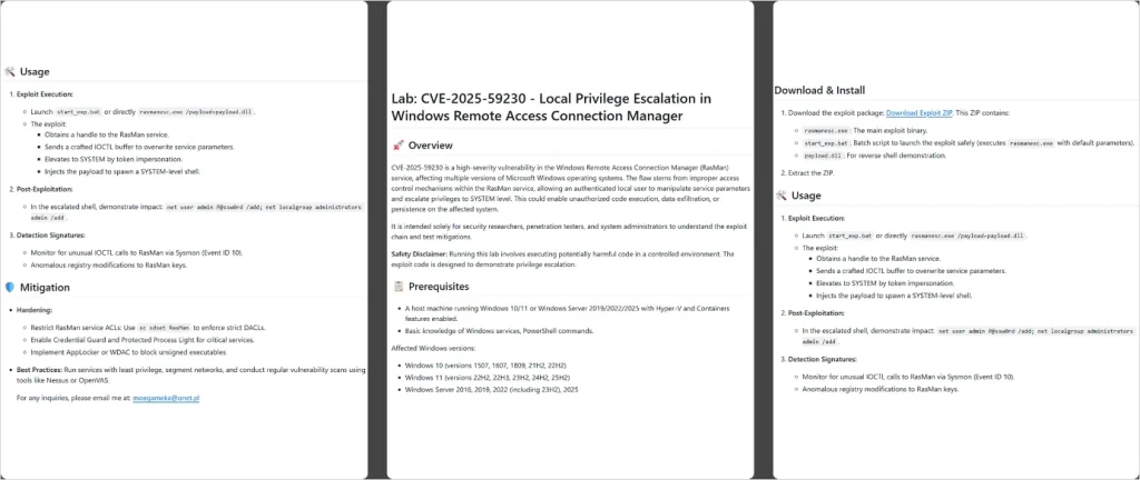 • CVE-2025-59230 – Ранливост за ескалација на привилегии (EoP) во услугата Windows Remote Access Connection Manager (RasMan). Локално автентициран напаѓач можел да искористи неправилна контрола на пристап за да ги ескалира привилегиите до SYSTEM ниво на засегнатите Windows инсталации.