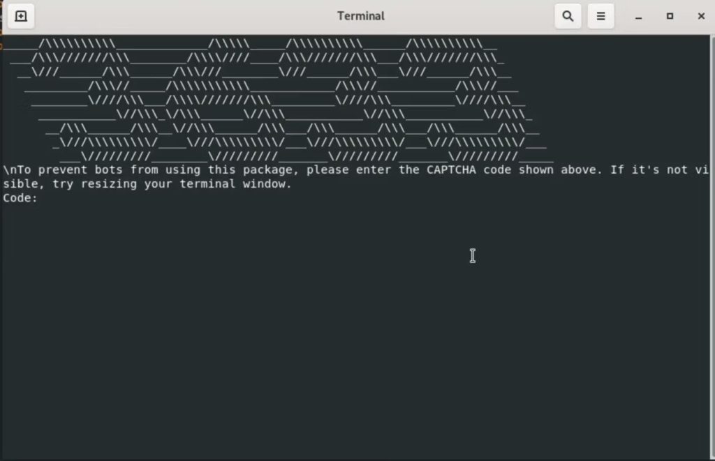 Скриптата прикажува лажен CAPTCHA во терминалот користејќи ASCII за да ѝ даде лажна легитимност на процесот на инсталација.